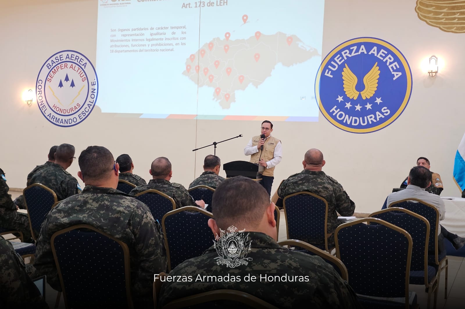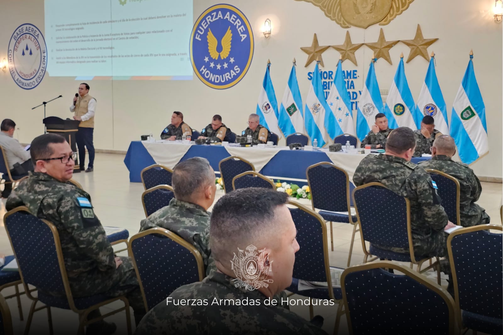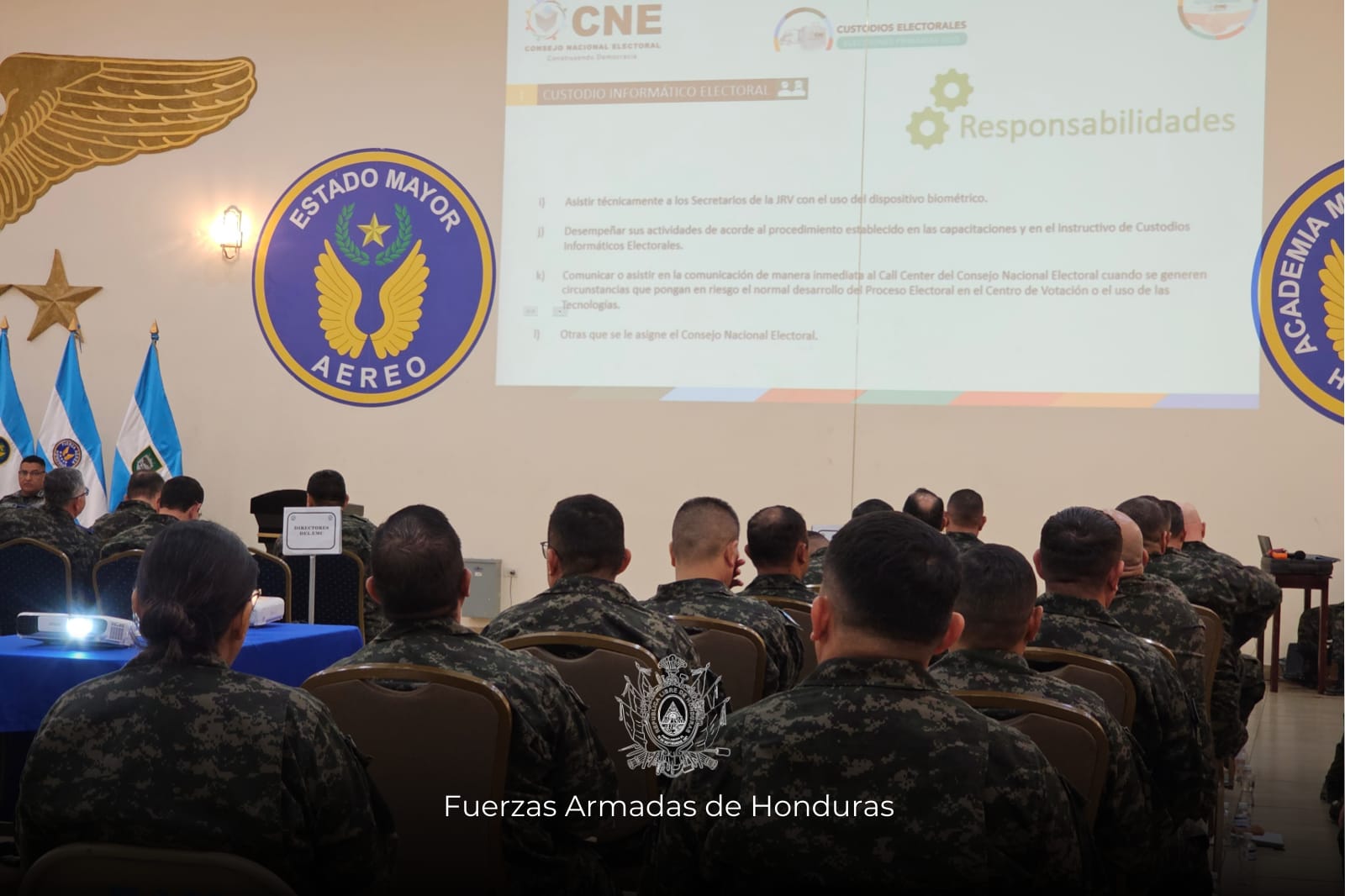Comandantes de las diferentes Fuerzas, Unidades y Dependencias de las Fuerzas Armadas de Honduras (FF.AA.) recibieron una importante exposición por parte de las autoridades del Consejo Nacional Electoral (CNE), con el fin de conocer los detalles sobre seguridad, transporte y custodia del material electoral.