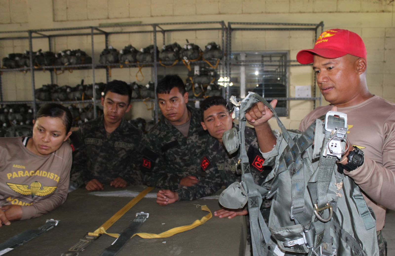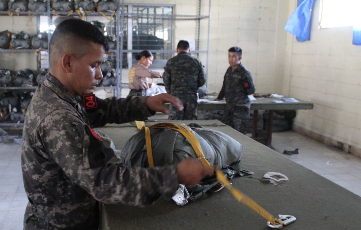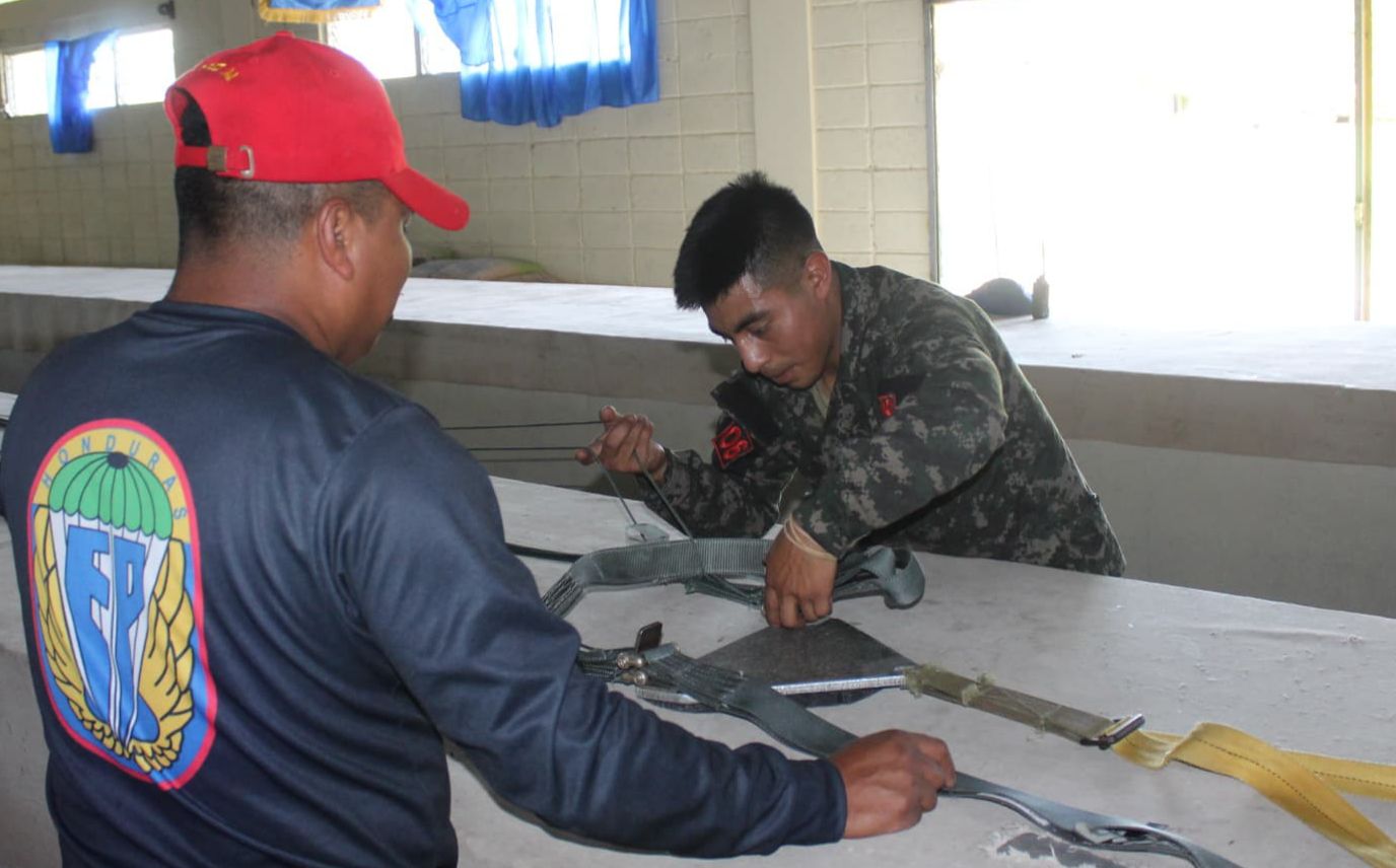 Como parte del adiestramiento técnico especializado impartido por las Fuerzas Armadas de Honduras, a través del Segundo Batallón de Infantería Aerotransportado Táctico, este día siete alumnos del Curso de Empacador #30-2025 llevan a cabo prácticas del proceso de empaque del paracaídas T-10 Delta.