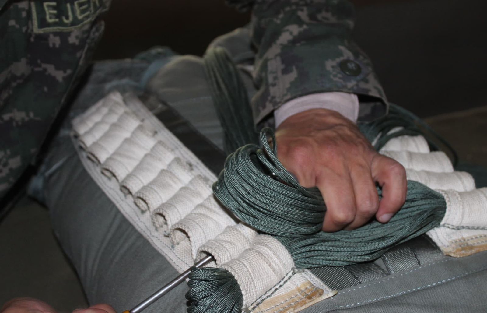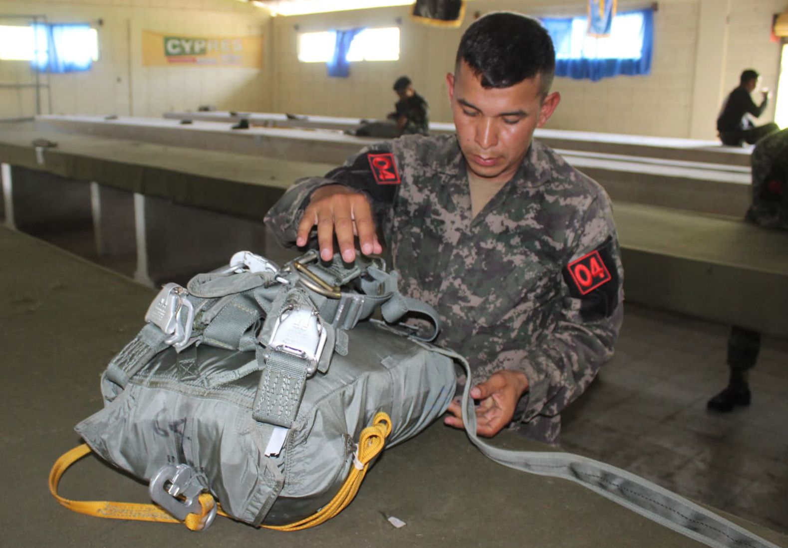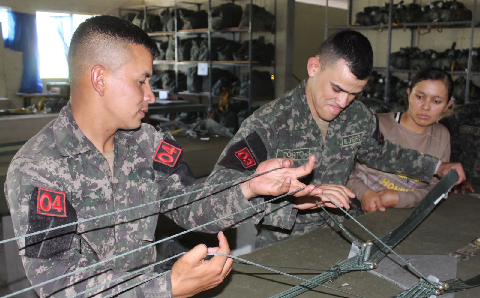 Como parte del adiestramiento técnico especializado impartido por las Fuerzas Armadas de Honduras, a través del Segundo Batallón de Infantería Aerotransportado Táctico, este día siete alumnos del Curso de Empacador #30-2025 llevan a cabo prácticas del proceso de empaque del paracaídas T-10 Delta.