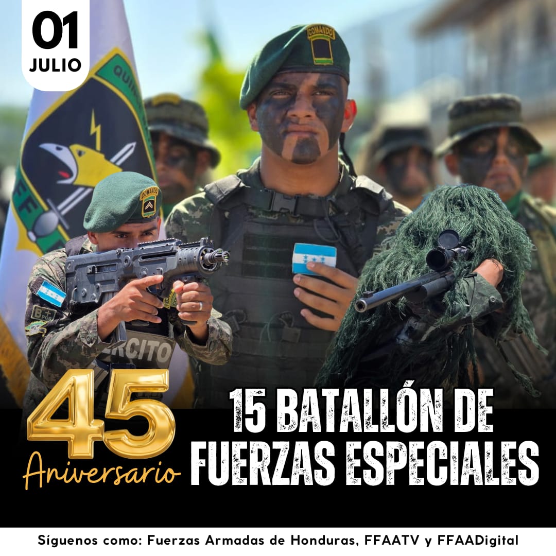 Hoy las Fuerzas Armadas de Honduras, rendimos homenaje al Décimo Quinto Batallón de Fuerzas Especiales en la conmemoración de su 45 aniversario de servicio a la patria.