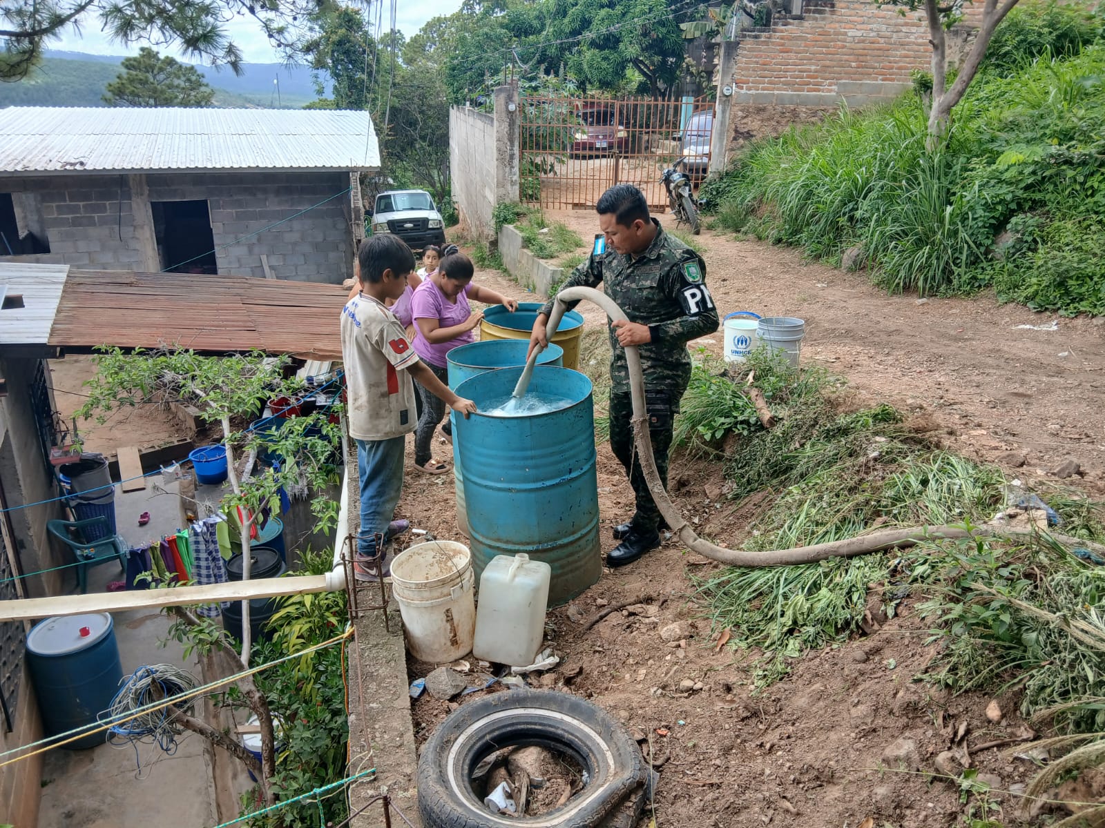 Las Fuerzas Armadas de Honduras, a través de la Policía Militar del Orden Público (PMOP), desarrollaron la proyección social del Programa Agua para Todos, como parte de las Acciones Cívicas Militares, abasteciendo con este vital líquido las instalaciones de la Escuela Policarpo Bonilla de la Colonia Villa Vieja de Tegucigalpa, así como a vecinos del sector que carecen de agua potable.