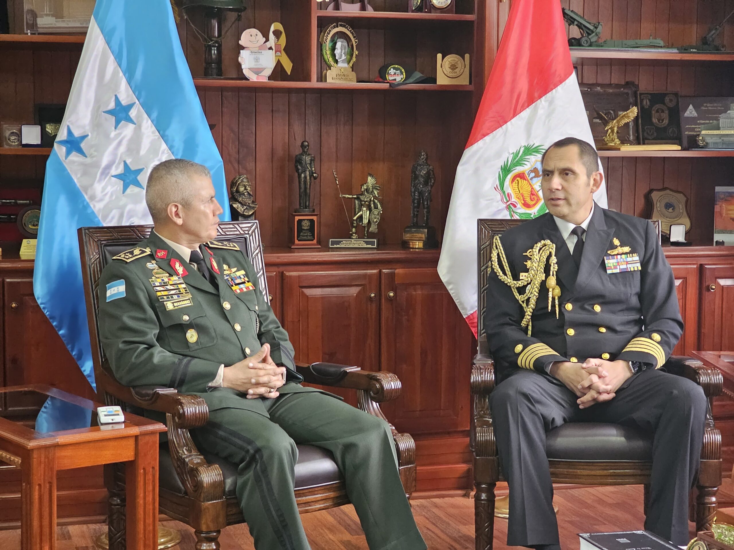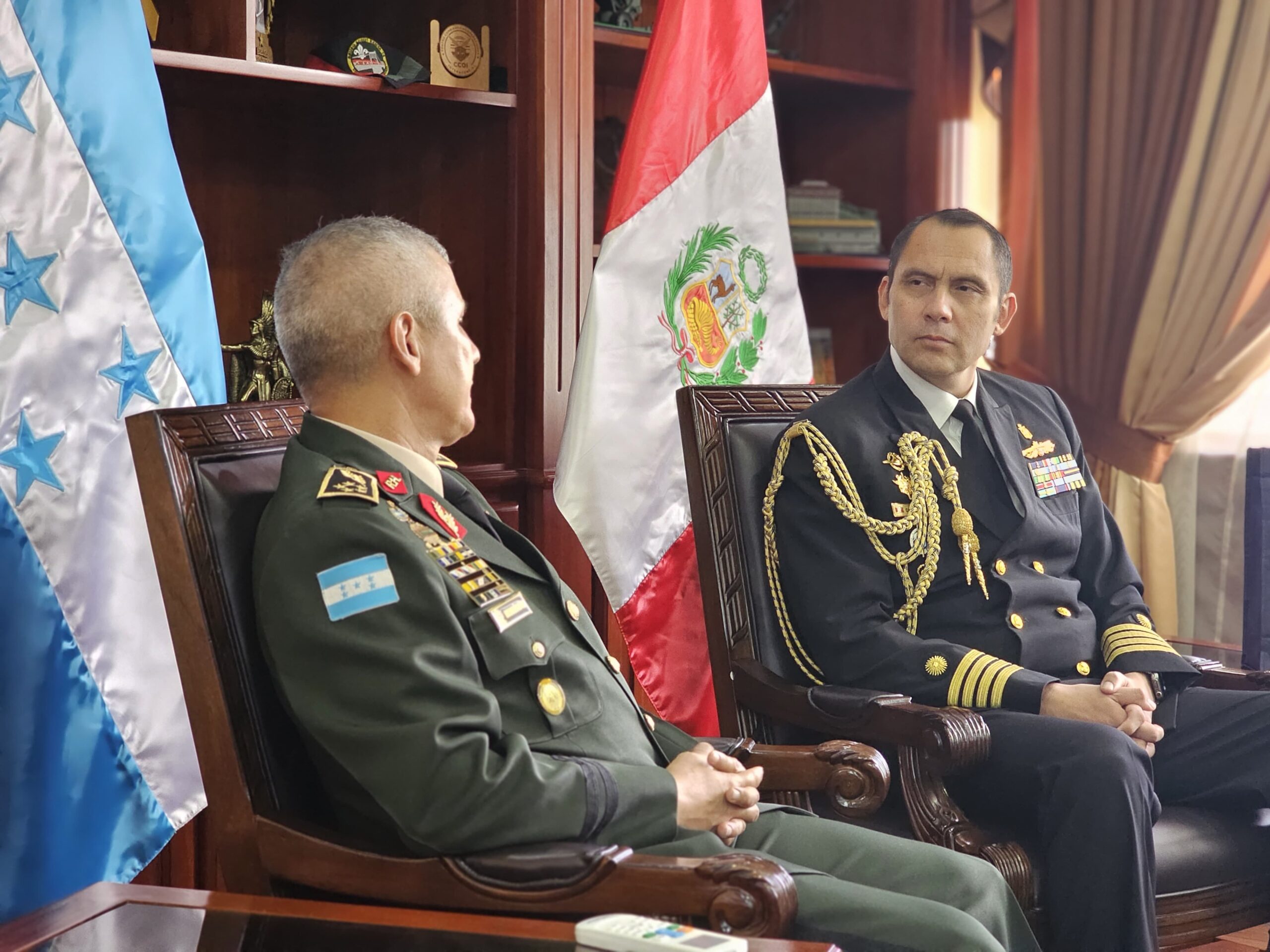 Quienes llevaron a cabo una reunión en la cual se abordaron temas vinculados a las cooperaciones bilaterales e intercambiaron de experiencias en temas de defensa y futuras colaboraciones entre las Fuerzas Armadas de Honduras y la Marina de Guerra del Perú.