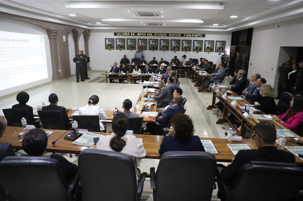 Los temas a tratar fueron expuestos por el Jefe del Estado Mayor Conjunto, General de División, Roosevelt Hernández, acompañado del Jefe de Operaciones y Adiestramiento, General de Brigada, Rafael Orellana y el oficial enlace de las #FFAA ante el Consejo Nacional Electoral de Honduras, Coronel de Artillería, Raúl Alexis Fuentes Borjas, quienes detallaron paso a paso la planificación y preparación de la institución para el próximo 30 de noviembre, fecha en que se celebrarán las Elecciones Generales 2025.